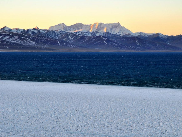 火红的朝霞布满东边的天空,太阳将红晕抹在了纳木措西边的雪山上,幽蓝深邃的纳木措,一半已经结成了冰变得洁白平坦,一半依旧蓝的发黑夺人心魄,这情景让绿豆突然一下想起那句流行的话:一半是海水一半是火焰,虽然这句话与眼前的风景、与纳木措毫不相干。