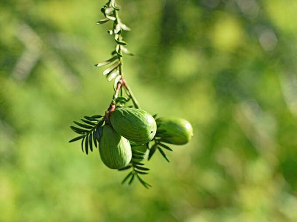 香榧花期4月中、下旬,果熟翌年9月,其果实一簇一簇地长在枝条上,素有"三代果"之称,一棵树上,往往一年果、两年果同时存在。(该幅图片来自网络)