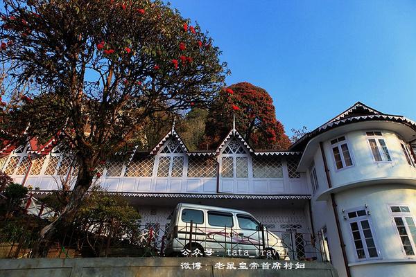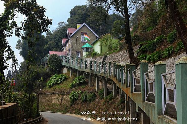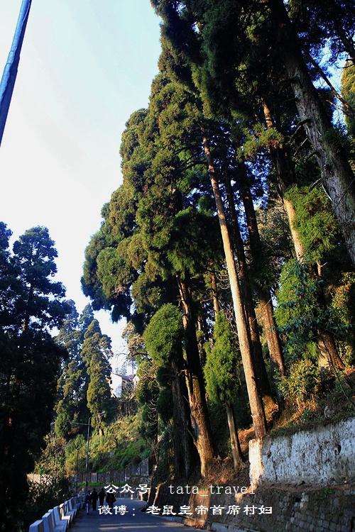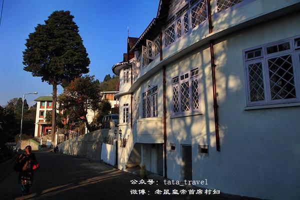 赶在日落前,我们沿着大吉岭山间的小道盘桓上升。大吉岭平均海拔超过2000米,道路两侧松柏参天,树木掩映之下各色洋房清雅而美丽。途中行人甚少,偶遇一人,四目相交,微笑以待,已觉岁月静好。逢交叉口,见几位小师傅,问来历,答曰打锡金而来。