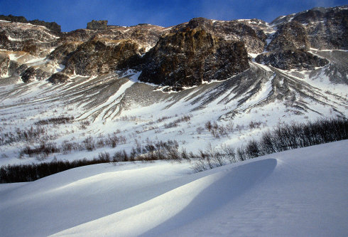 温泉边,因为蒸汽上升遇冷结成树挂,一排排扎着白色小辫的松树在蓝天的映衬下格外的美丽。泡露天温泉最豪华的地方就是大宇宾馆,一个人80元,里间是淋浴间,大池从墙底通到户外,男女隔着一道石墙。身子浸在滚烫的温泉里,头上飘着雪,发梢上结了一层薄冰。远处是白茫茫的雪山,你裸奔也不怕有人偷窥。