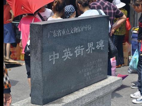 到了里面看到了那个电视报道中出现的界碑,这个立于1898年光绪期间刻立的界碑,将沙头角一分为二,东侧为华界中英街,西侧为英(港)界沙头角,故名"中英街"。这个界碑也是曾经丧权辱国的一个标志。