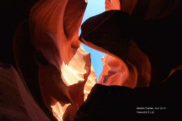 羚羊谷中唯一的光源就是上方地面的狭缝,在不同时间阳光照射进来的角度不同,会使峡谷呈现出各种美丽诡异的色彩。下面我拍摄的图片大多是下羚羊谷。因为参观上羚羊谷我报的是普通团,没有带三脚架,所以效果不好。