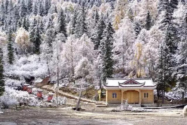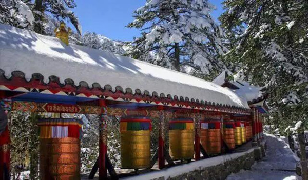 旁边的一根根转经筒,在大雪中滚滚流转,仿佛要让佛音来赞叹着空谷寂寥的景色。