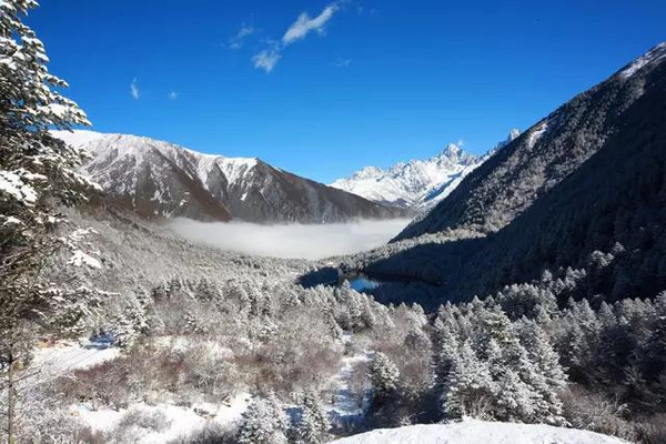 被大雪覆盖的七色海,静谧的湖水倒映着蓝天、雪山以及白绒绒的树木,显得那么高端典雅,让人迷醉。
