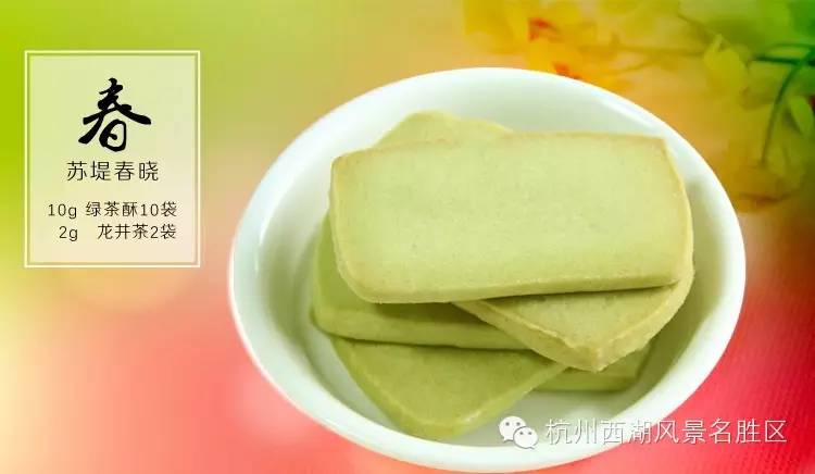 绿茶酥:午后的时光总会给人镀上一层慵懒的味道, 品一片绿茶酥,入口甜而不腻,清爽酥脆,给味蕾增加点跳跃的快感,泡一杯西湖龙井茶,舒缓一下疲劳的心,亲爱的,对自己好点!