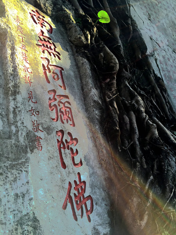 炫丽彩虹、摩崖石刻、枯藤新牙。三个完全不搭界的物什,在这里,被阳光疏忽激活,成为生命的华章。