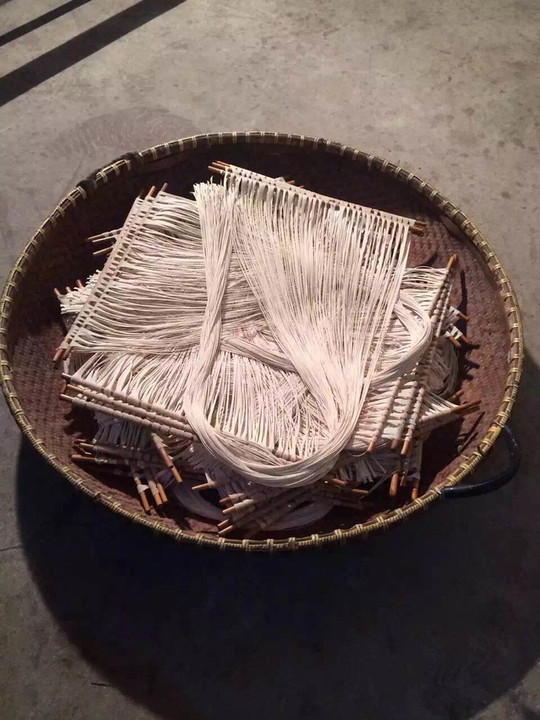 将索面定型后,制作并没有完成,需要将粘在一起的索面分隔开,直至索面完全风干。至此索面才算制作完成了,将索面用剪刀剪落,放置于房间做干燥的地方,便于保存。