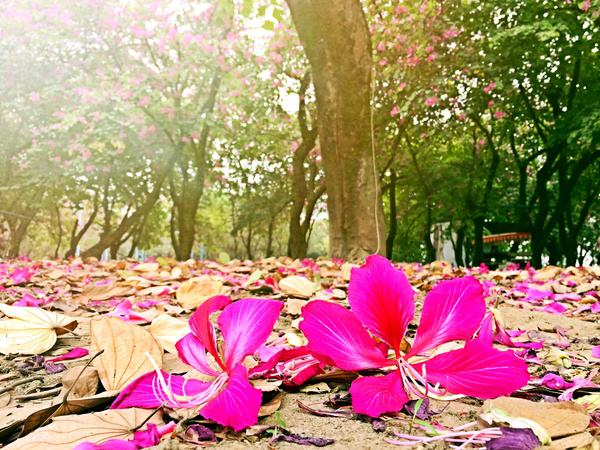 满地紫荆花堆积,木有憔悴损,只有秋意浓。