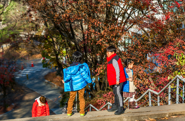 在梨大校园,曾经拍摄过一部电影《女高怪谈5:结伴自杀》,听着名字我都不能跟梨大眼前的景象结合起来。这部电影在韩国也是必须年满15周岁的人才能观看,它确实是部恐怖片,2009年在梨大一百周年校庆时,该电影在梨大的纪念馆首映,据说导演是看中了梨大门口那座基督教堂,所以很多场景在教堂周边拍摄的。有关电影我并没看过,我只是不想让那恐怖来破坏梨大眼前这红艳艳的枫叶美景。