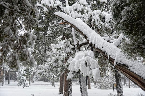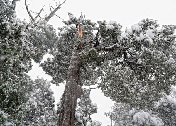 景区管理人员不时提醒游客别在树下走:听到断裂声赶紧捂着头跑开。就在我身后,这枝古柏轰然断裂,散落的雪花溅我一身。