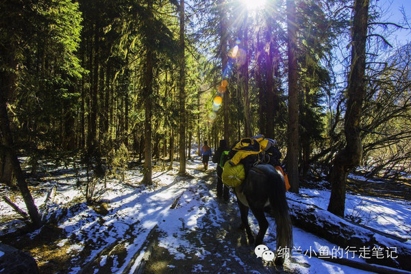 牵马的是一个年青的藏族小伙子,一脸的阳光与友善。刚开始,我还痴迷着那些目不暇接的美好风景,拿着相机不断地咔嚓咔嚓。可是一心不能二用,稍不留神,身体就被晃得厉害,相机只好乖乖地放回背包里,专心上路。小伙子不断提醒着我要抓紧马缰绳,踩住马蹬。大伙儿在马背上颠簸着,很是惊险也很是刺激,惊呼声、欢笑声时常在林间响起,久久回荡。