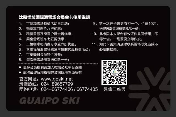 沈阳怪坡国际滑雪场会员卡不享受叠加制度优惠;会员卡为实名制一卡对一人,在购票前请客户主动出示会员卡。